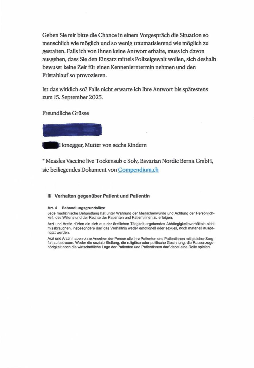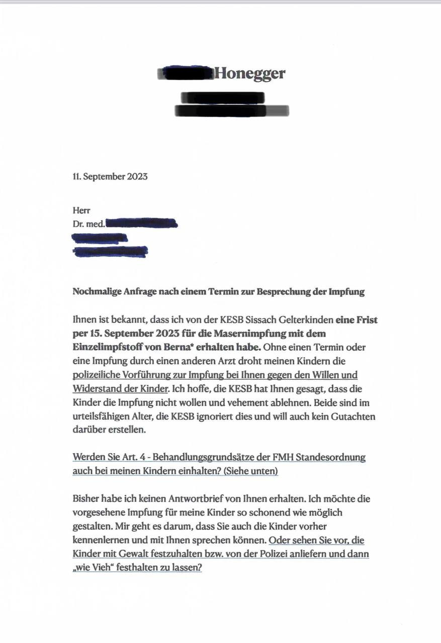 Brief an den Impfsarzt der in Auftrage der KESB Sissach-Gelterkinden - notfalls mit Anlieferung der Kantonspolizei BL - vollstrecken soll.